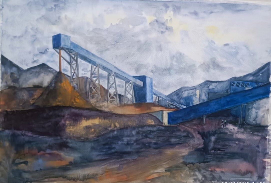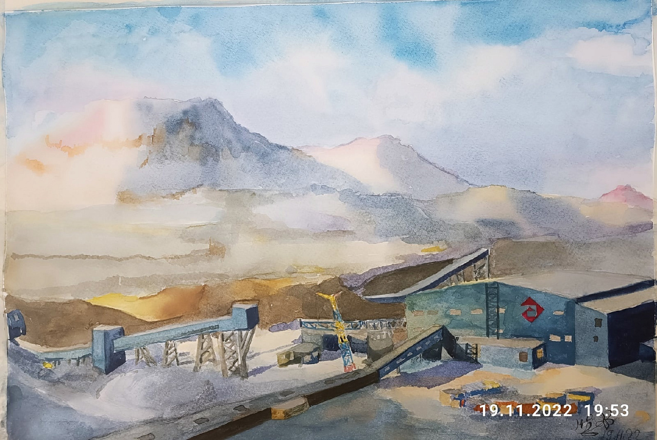 Художественным языком Мария рассказывает о масштабе и красоте промышленных ландшафтов. Её полуфинальные работы родились после знакомства с индустриальной панорамой ГОКа «Павлик» и стройплощадкой будущего ГОКа «Кумроч» — объектов, где прикладная работа наших инженеров обретает монументальные формы.